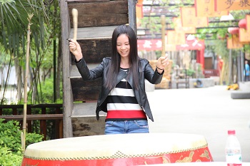 在到达了目的的后,还没有下车,大家就听到一阵阵的锣鼓声,使得人精神更为振奋,当下车一看,才知道这是水浒山庄欢迎大家的到来特意准备的欢迎仪式,其声音的震撼也让有的同事按捺不住心里的热情,也纷纷上前敲了起来,虽然敲出的声音不是非常的有节奏感,但是逗的大家都非常的开心。